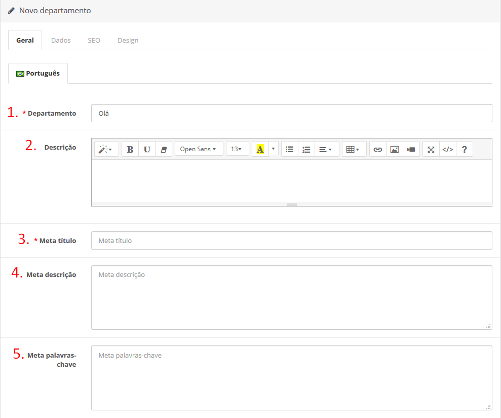 4 – Meta descrição: é a descrição que será inserida automaticamente no HTML da página do departamento, com o fim de fornecer um resumo da página em buscadores.